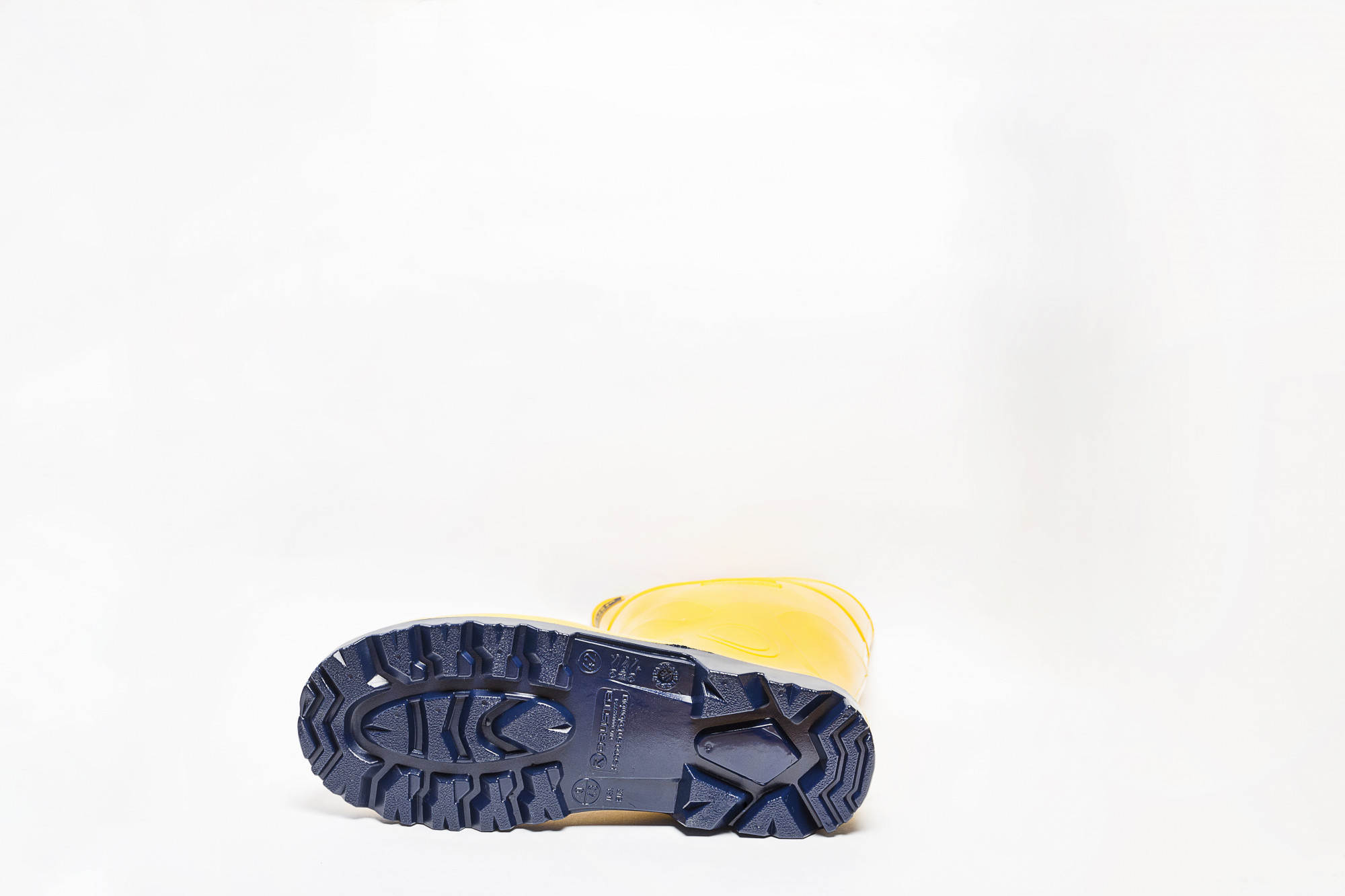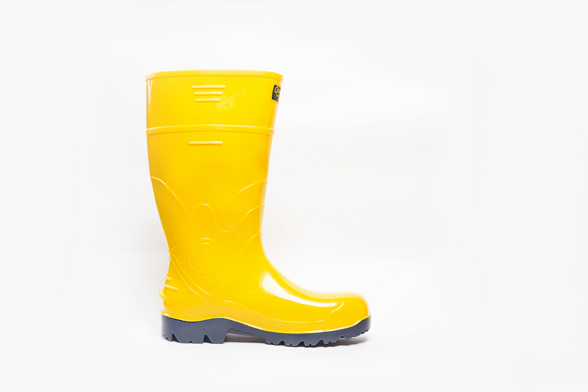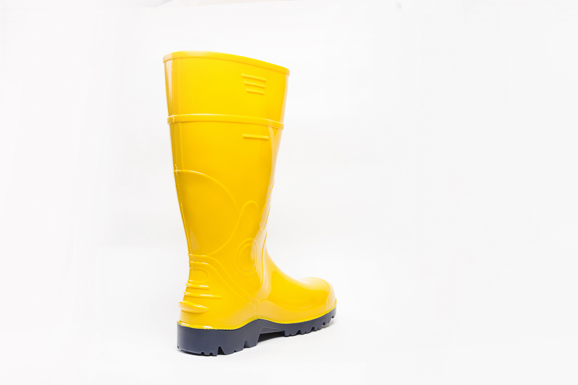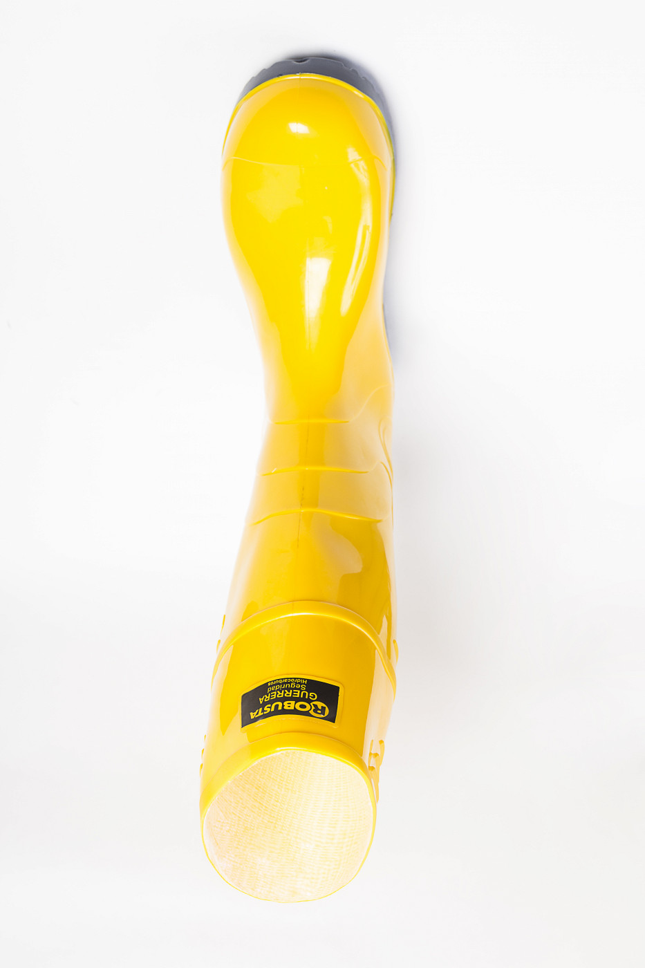 BOTA GUERRERA DE SEGURIDAD PVC. Puntera en acero, impermeable, antideslizante, resistente a hidrocarburos, inyectada en PVC bicolor. Color: Amarilla con zuela azul RH. Usos: Gasolineras, Petroleras, Frigoríficos.