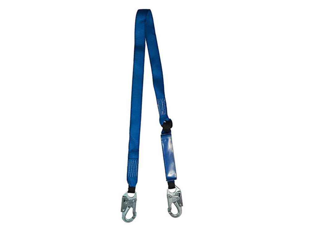 Cinta de seguridad con suspensión y amortiguador, 4.5 cm de ancho, con dos (2) mosquetones pequeños de alta seguridad, color blanco con tratamiento de zinc, posee absorbedor de energía de 6 ft (1.8 m) de longitud, diseñado para amortiguar y reducir la fuerza del impacto producida por la detención; tejido principal color azul. Material: fibra poliéster.